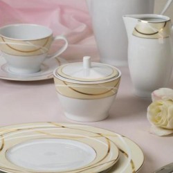 Service de vaisselle sobre et raffiné. En porcelaine avec des dégradés de couleurs douces, crème, parme clair, chaque fois soulignés de fins liserés dorés s'accordera avec tous les styles.