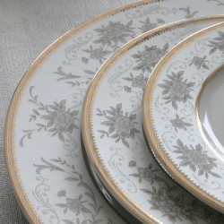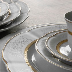 Service de table complet en porcelaine blanche. Art de la table fin avec décoration grise et or. Des couleurs éclatantes pour une table prestigieuse. Avec un large filet d'or qui souligne l’élégance de ce modèle intemporel pour ajouter délicatesse et modernité à la table. Service en porcelaine fin et délicat alliant modernité et qualité européenne. Un service idéal à ajouter à votre liste de mariage.